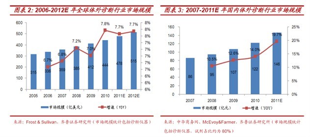 據(jù)McEvoy & Farmer 的市場報告《中國臨床診斷市場(2011)》預測,我國體外診斷行業(yè)未來增速有望達到15%-20%,遠遠超過全球5%-7%的增長,至2015 年成為全球第三大市場;